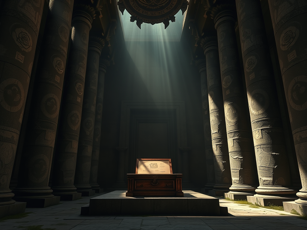 Toen ze de tempel binnentrad, werd ze meteen overvallen door een soort eerbied. De ruimte was groter dan ze had verwacht, met enorme zuilen die de lucht in reikten en zich als gedempte schaduwen uitstrekte naar de met rozen bedekte muren. Het was een vreemde mengeling van verval en schoonheid. In het midden stond een groot altaar, waarop een houten doos lag. De doos was bedekt met een dunne laag stof, maar iets aan de manier waarop de doos daar lag, straalde een onverklaarbare kracht uit.